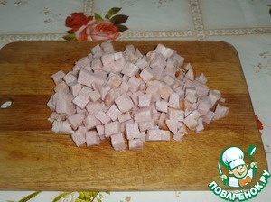 • Затем выкладываем нарезанную ветчину. Равномерно распределяем.