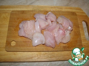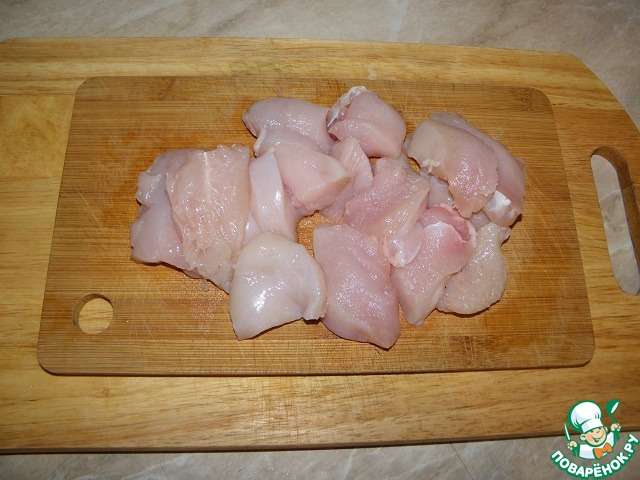 Куриное филе режем на небольшие кусочки толщиной в районе 1,5см