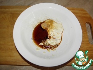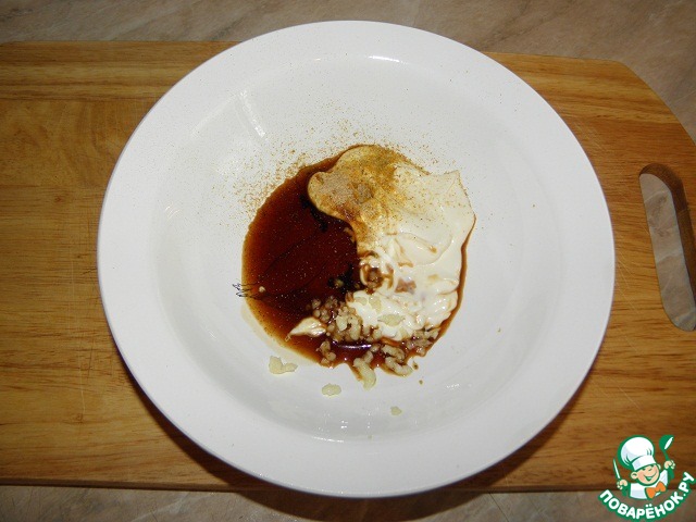 Для маринада: Соевый соус соединить с майонезом, добавить карри, молотый имбирь, чеснок (через пресс), все перемешать