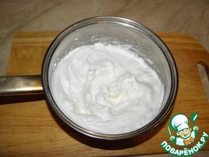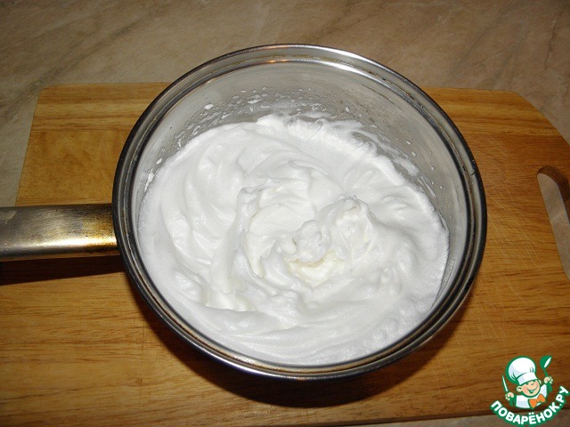 Охлажденные белки взбить с солью (на кончике ножа) до устойчивых пиков