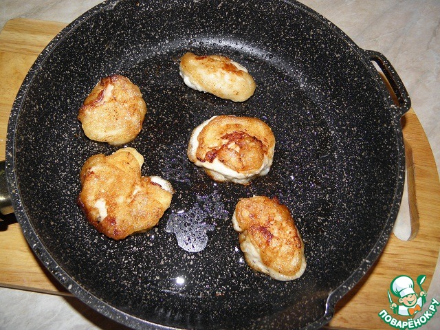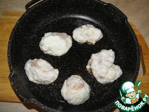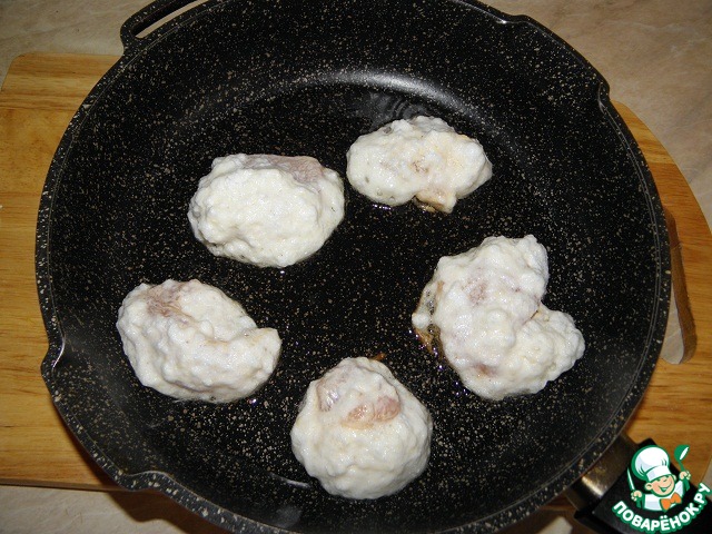 Берем вилкой кусочки филе, хорошо окунаем в кляр