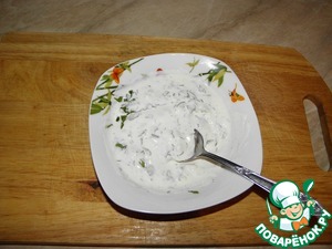 Подготовить соус: В сметану добавить измельченную зелень. чеснок (через пресс), специи соль, перец