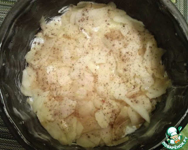 Хорошо смазываем сливочным маслом форму для выпечки. Выкладываем слой яблок (половину нашей заготовки), посыпаем корицей (сладкоежки могут присыпать сахаром!)