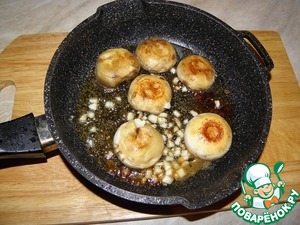 • Обжарить одну сторону до золотистого цвета, перевернуть на другую, добавить чеснок.