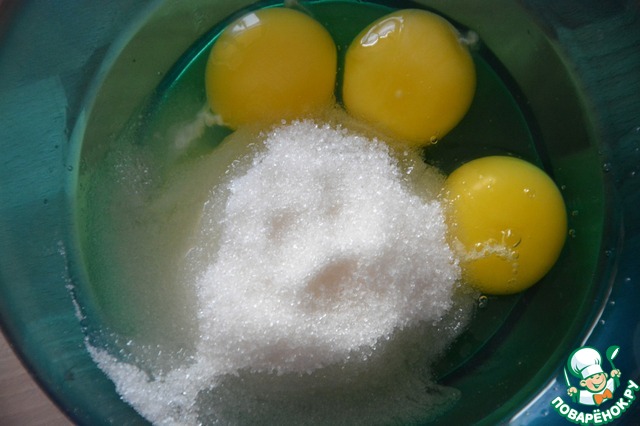 В небольшой кастрюле на малом огне растопить сливочное масло и мед. Не доводите до кипения. Уберите с огня. В миске смешать сахар и яйца. Перемешать.