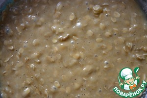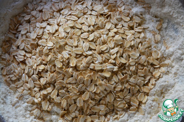 Добавить муку, разрыхлитель, корицу (по вкусу). Высыпать овсяные хлопья и растопленное масло с медом.