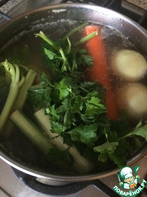 Курицу ( у меня четвертинка домашней) залить 2,5 л воды и поставить варить бульон. Через 20-25 минут добавить целиком морковь, лук, сельдерей, зелень (я связываю ниткой, чтобы потом удобно было достать и выкинуть).