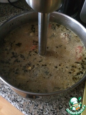 Через 15 минут - капуста и репа будут уже готовы, достать курицу из супа, отделить мясо от костей. И тем же временем добавить плавленый сырок и приправы. Помешивая, дождаться пока сыр расплавится. Затем снять суп с огня и пюрировать блендером.