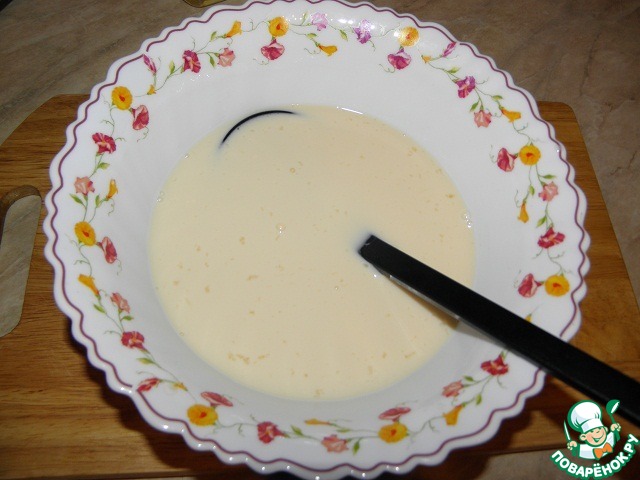 Соединяем их с молочно-крахмальной смесью и хорошо перемешиваем. Не бойтесь, будет казаться, что тесто жидковато, но это нормально.