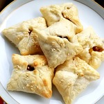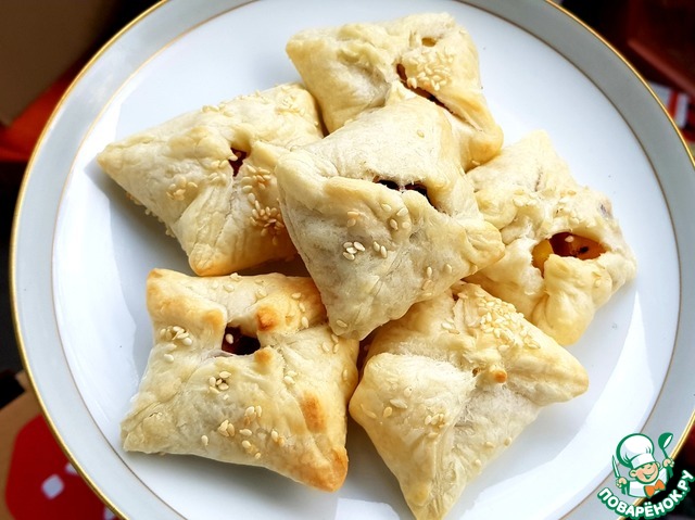 На квадратики положить начинку, защипнуть края конвертиком, смазать взбитым яйцом, посыпать кунжутом или маком и испечь.