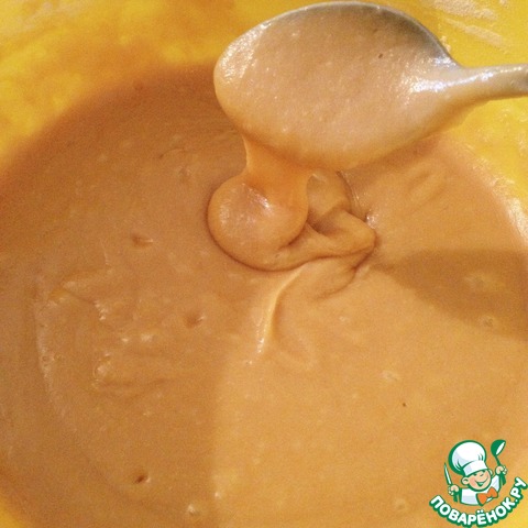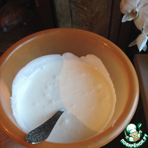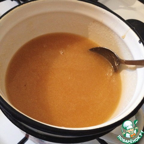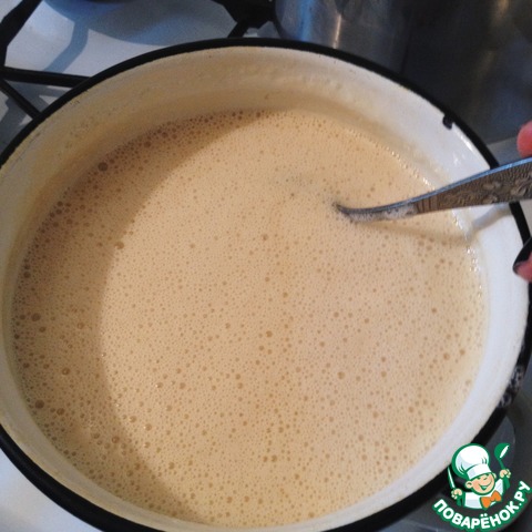 Добавить сметану с содой и подержать на бане до тех пор, пока масса не перестанет пениться. Я не стала ждать, пока пузыри спадут полностью, главное, чтобы ушла основная часть.
