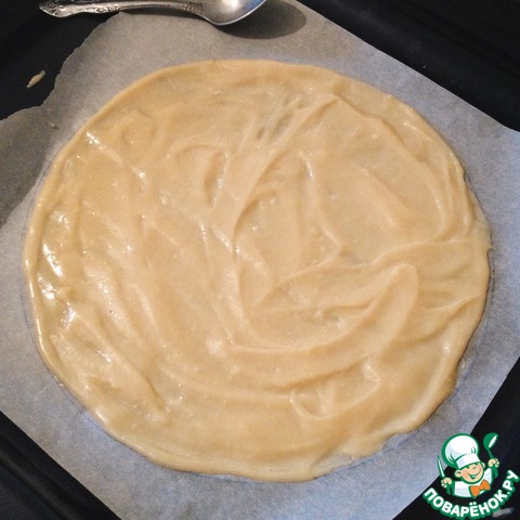 Я начертила на обратной стороне пергамента круги 24 см диаметром, перевернула лист и ложкой распределила тесто внутри круга.
