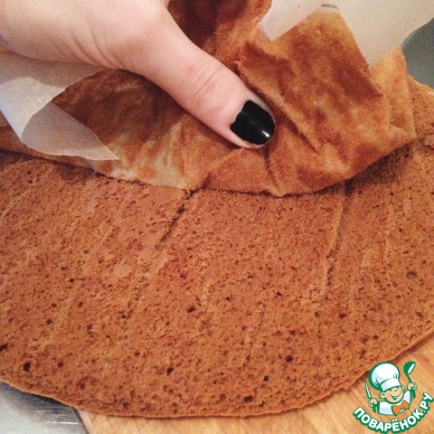 Снять с коржей пергамент, остудить и обрезать до 21 см диаметром. Обрезки измельчить в крошку.