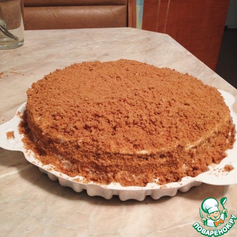 Обмазать кремом верх и бока торта, посыпать измельченной крошкой. Убрать торт в холодильник на ночь.