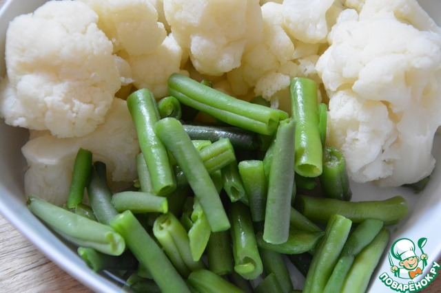 • Цветную капусту и стручковую фасоль отварить до готовности в подсоленной воде. Погружным блендером размять в пюре.
