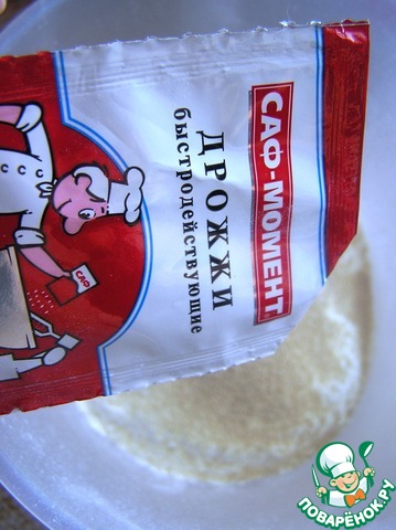 Просеять муку и манку, смешать с дрожжами «САФ-момент». Добавить сахар и соль.