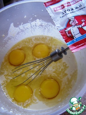 Влить теплое молоко, добавить яйца и хорошо вымешать тесто. Добавить растительное масло и еще раз вымешать. Поставить в теплое место для подъема, прикрыв салфеткой.