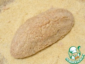 • Теперь делаем котлетки. Берем часть фарша, делаем лепешку и кладем на середину свинину. Закрываем края и формируем котлетки. Обваливаем в сухарях.