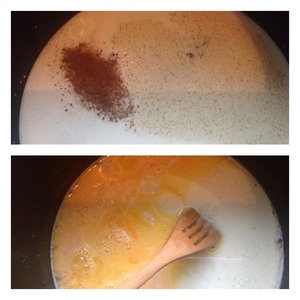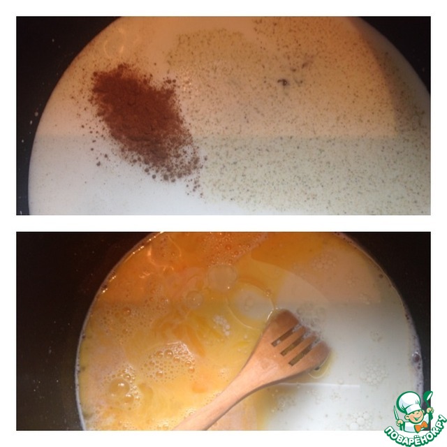 В молоко добавить корицу, кардамон и мед. Разогреть молоко почти до кипения, постоянно помешивая, чтобы мед растворился и подружиля со специями. Остудить молоко до комнатной температуры. Взбить яйца и влить в тесто вместе с маслом. Перемешать.