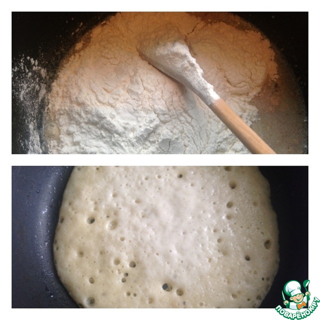 Всыпать муку и замесить тесто ложкой. Не взбивать миксером. Оставить тесто на 20-30 минут в теплом месте. Выпекать блины с двух сторон на сковородке смазанной растительным маслом.