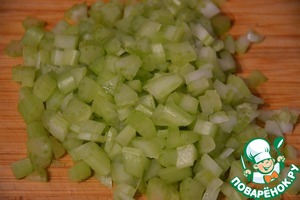 Две стрелки сельдерея нарезать полушайбами или кубиками. Чеснок очистить мелко нарезать. Все овощи обжарить с добавлением растительного масла 15 мин на среднем огне.
