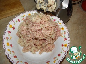 Пропустить через мясорубку куриное мясо, капусту и лук