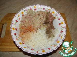 Рис заранее отварить, добавить к фаршу с овощами, посолить, поперчить, хорошо перемешать