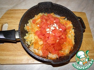 Затем добавляем очищенный и порезанный кубиком помидор, рубленный чеснок, солим, перчим, добавляем еще паприку