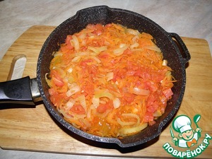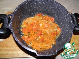 Далее, овощную заправку делим на две части, половину выкладываем на дно кастрюли