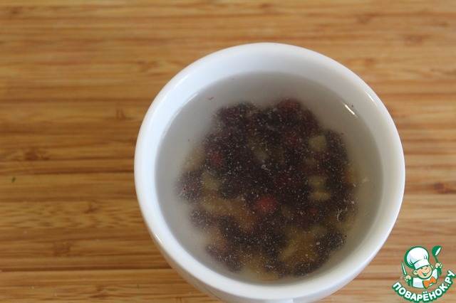Клюкву и цукаты замочить в 250 мл воды на 30 минут.