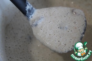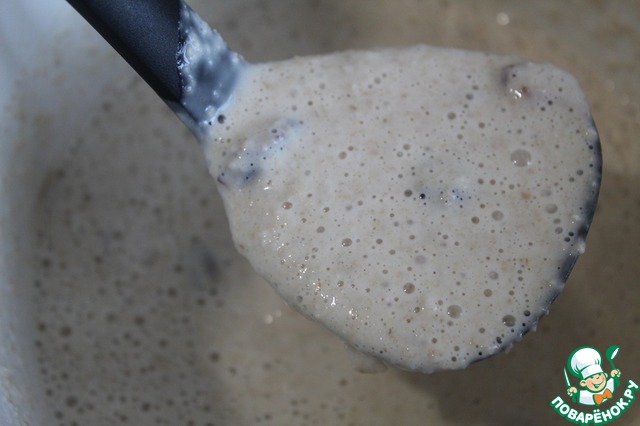 Всыпать просеянную муку, соль и перемолотую овсянку, перемешать, накрыть и поставить в теплое место на час. -
