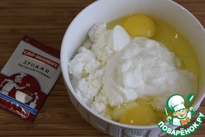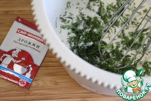 Соединить творожную и мучную смесь, добавить укроп, перец, размешать накрыть и поставить и теплое место на 45 минут.