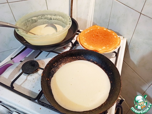 Сделать блины на кефире мне посоветовала мама, т. к. они получаются более тонкими и нежными.