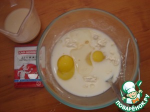 • Муку ржаную и пшеничную соединяем с сахаром и солью, наливаем молоко и разбиваем 2 яйца, добавляем масло подсолнечное. Соединяем.