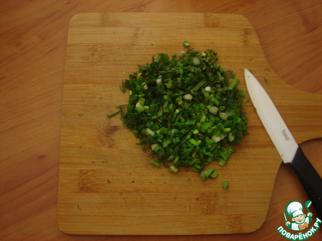 Зелень мелко рубим. Отправляем в готовое тесто. Перемешиваем.