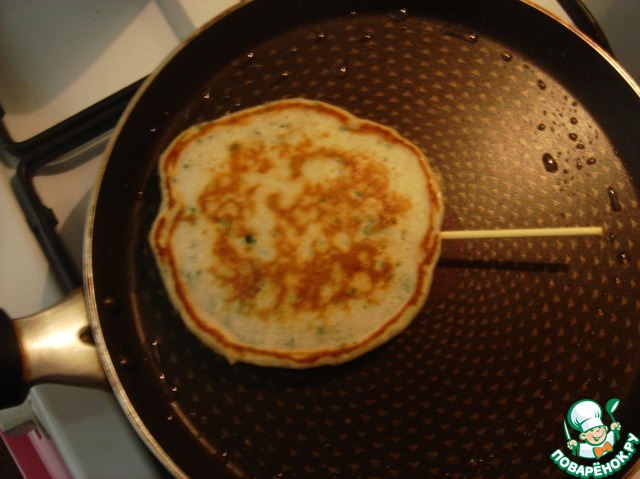 Выкладываем тесто на разогретую, подмазанную сковороду ложкой. Берём деревянные шпажки для шашлычков и ломаем их на 2 части. Когда выложим тесто на сковороду, то палочку выкладываем посередине оладья. Жарим с одной стороны и переворачиваем на другую, доделываем. Палочки отлично закрепляются в тесте.