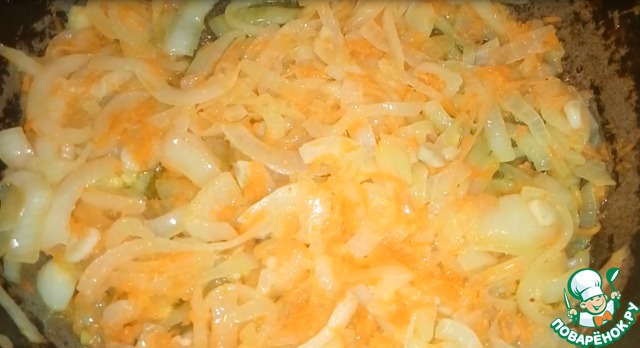 Лук нарезать полукольцами, морковь натереть на мелкой терке, чеснок нарезать мелкими кусочками. Обжарить