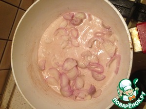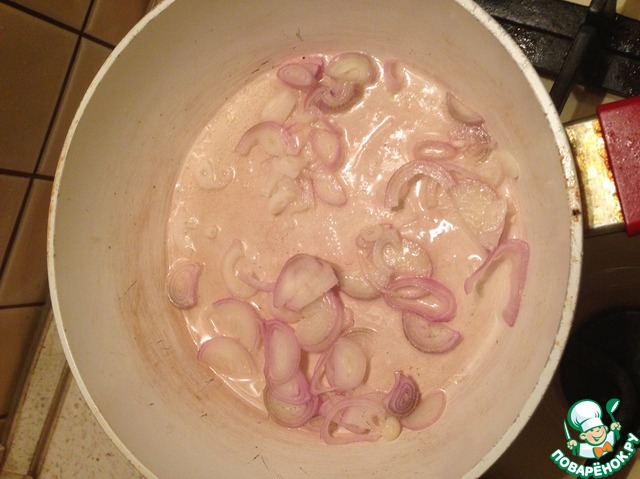 • Лук режем полукольцами и выкладываем на разогретую сковороду с растительным маслом