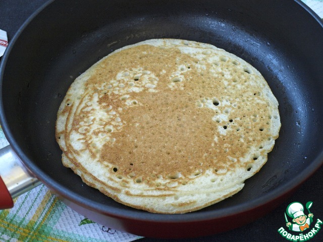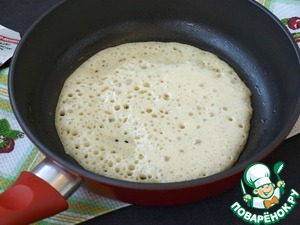 Силиконовой кисточкой, смоченной в подсолнечном масле смазать горячую сковороду и половником налить порцию теста. Сразу увидите, как появляется множество дырочек.