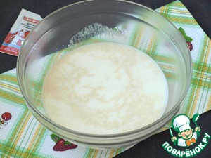 Подогреть молоко, добавить в него сахар и дрожжи, оставить на 15 минут в тёплом месте.