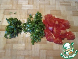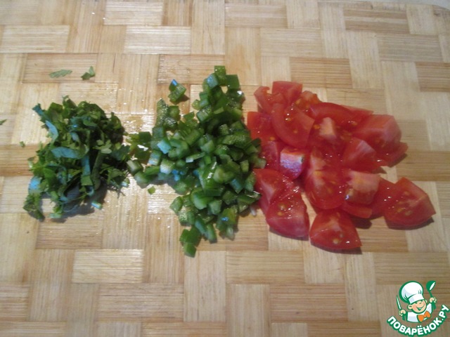 Болгарский перец и перчик чили очистить от перегородок и семян, порезать мелкими кубиками. Кинзу измельчить.