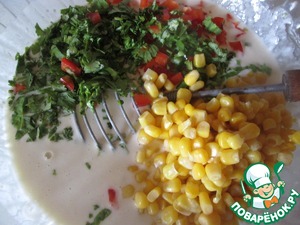 Добавить в тесто порезанные овощи, зелень и кукурузу, все тщательно перемешать.