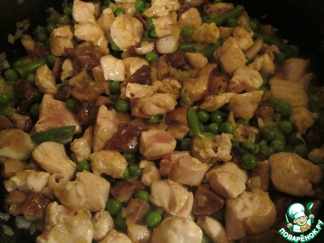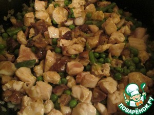 В сковороде разогрейте растительное масло, обжарьте лук до прозрачности, добавьте курицу, готовьте минут 5 - 7. Затем к курице добавьте овощи и грибы. готовьте еще минут 5, посолите, поперчите по вкусу, снимите с огня.
