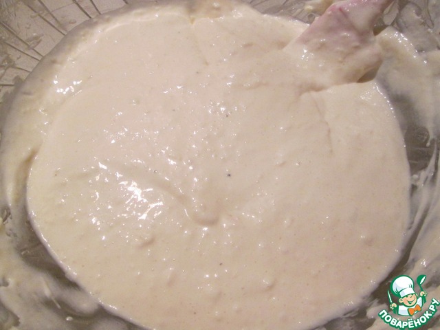 Пока остывает наша начинка, займемся тестом. Смешайте майонез, сметану и яйца, немного присолите, небольшими порциями добавляйте муку и с последней порцией добавьте соду. Вообще-то соды в оригинальном рецепте не было, но я решила попробовать добавить. Тесто получилось очень нежным и не мокрым, по консистенции, как густое тесто для оладьев.