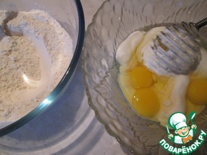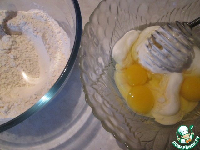 Просеять муку в миску, добавить соль, сахар и перец. В другой миске слегка взбить яйца со сметаной.