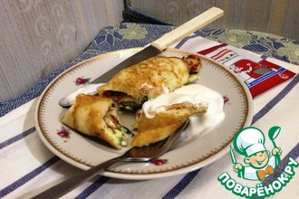 На блинчики выкладывать небольшое количество начинки, свернуть трубочкой и подавать со сметаной.