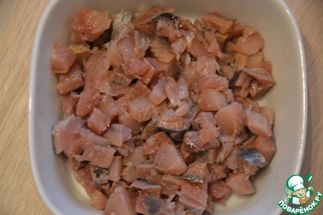 У одной сельди удалить хвост и голову, очистить, выпотрошить. По возможности максимально удалить кости. Филе порубить ножом на некрупные кусочки.