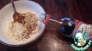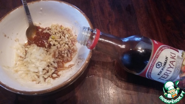 Для маринада корень сельдерея натереть на крупной терке и смешать его с рубленным чесноком, аджикой, 1 ч. л вустерского соуса, коньяком и 1 ст. л соуса-маринада "Терияки" от ТМ "Киккоман".