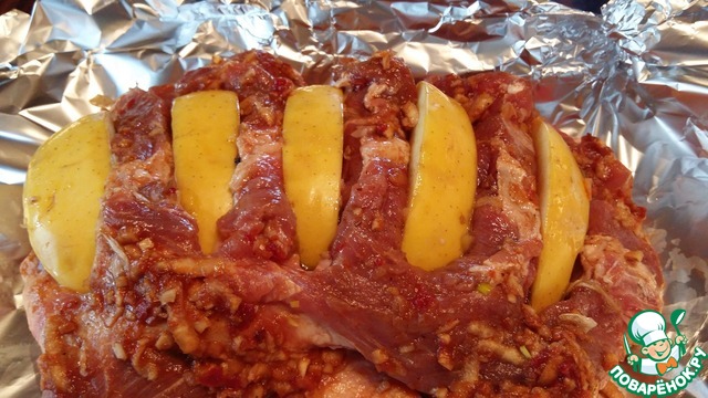 Квашеную капусту слегка потушить и нафаршировать ею каждый надрез. Сверху накрыть яблочной долькой. Завернуть в фольгу и запечь в духовке. У меня мясо запекалось 75 минут при t 220 градусов.