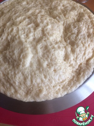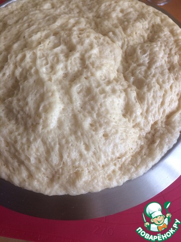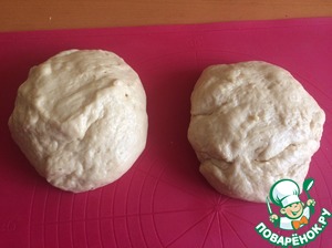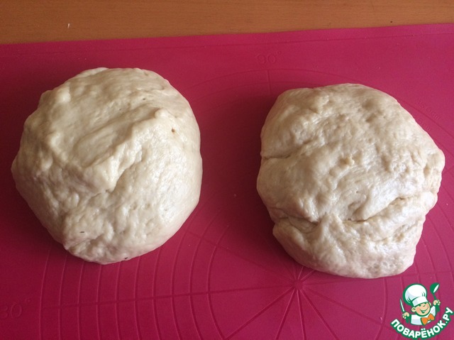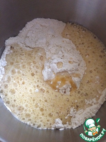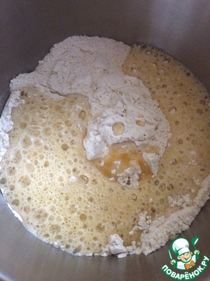 Тем временем просеять муку. Дрожжи забродили, добавить опару к муке, влить оставшуюся молочную смесь, вбить яйцо, соль и замесить тесто. Далее тесто поставить для подъёма в тёплое место примерно на 45-50 минут.